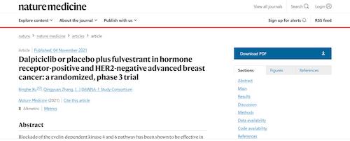 11月4日,国际四大医学期刊之一、英国《自然》旗下《自然医学》(Nature Medicine)在线发表CDK4/6抑制剂达尔西利(SHR6390)联合氟维司群治疗既往内分泌治疗后疾病进展的HR+/HER2-晚期乳腺癌的多中心、随机、双盲III期临床研究(DAWNA-1研究)中期分析结果报告,首次对氟维司群(雌激素受体降解剂)±达尔西利治疗激素受体阳性晚期乳腺癌的有效性和安全性进行了比较。研究结果显示,达尔西利+氟维司群组与安慰剂+氟维司群组相比,无进展生存期(PFS)显著延长。该项研究由中国医学科学院肿瘤医院徐兵河教授担任leading PI,全国39家医院参研,由永利皇宫官网医药临床研发团队支持完成。