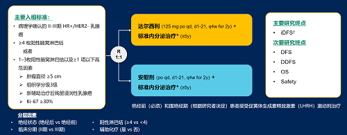 达尔西利(Dalpiciclib)是永利皇宫官网医药自主研发的口服、选择性的小分子CDK4/6抑制剂,也是中国首个自主研发的新型高选择性 CDK4/6 抑制剂,已证实其与内分泌治疗(ET)联合用于 HR+/HER2- 晚期乳腺癌的一线和后线治疗时,均显著改善无进展生存期(PFS)6,7。因此开展了一项随机、双盲、III期临床试验(DAWNA-A),以进一步评估达尔西利联合内分泌治疗作为高危早期 HR+/HER2 - 乳腺癌辅助治疗的效果。本研究纳入高危复发风险人群需满足以下标准之一:①≥4 枚阳性腋窝淋巴结;②1–3枚阳性腋窝淋巴结且合并≥1 项高危因素(肿瘤直径 ≥5 cm,组织学分级3级,辅助治疗后残留浸润性乳腺癌,Ki-67 ≥30%)。本文呈现预先设定的首次中期分析(IA1)结果。