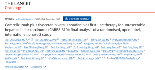 [1]Qin S, Gu S, Chan SL, et al. Camrelizumab plus rivoceranib versus sorafenib as first-line therapy for unresectable hepatocellular carcinoma (CARES-310): final analysis of a randomised, open-label, international, phase 3 study[J]. Lancet Oncol, 2025, 26(12):1598-1611.